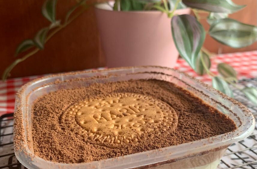 1. Siapkan wadah atau box, celupkan biskuit ke susu UHT dan susun sebagai lapisan dasar.